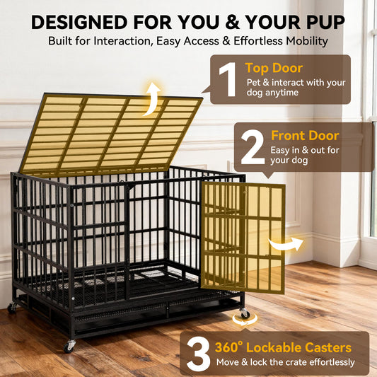 Oranland 48Inch Heavy Duty Dog Crate Cage Kennel with Wheels, High Anxiety Indestructible, Sturdy Locks Design, Double Door and Removable Tray, Extra Large XL XXL